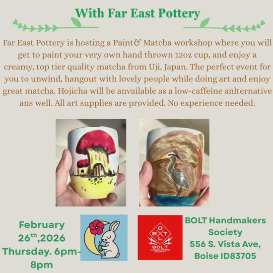 Come enjoy a relaxing evening of Art& Matcha! We will be learning a little bit of matcha history and its culture, handmade pottery. You will get to paint your very own 12oz cup that you can pick up days after the workshop. A silicone lid is available for purchase at the event for $10 for you to use turn your cup into a to-go travel cup.